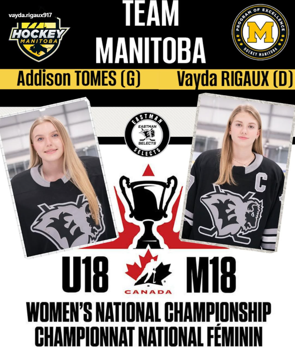 The Eastman Selects are proud to announce that defender Vayda Rigaux (Winnipeg, MB) and netminder Addison Tomes (Winnipeg, MB) have both been selected for this year's U18 POE Team Manitoba final roster. This will be Rigaux's first time being selected while Tomes returns for a second stint with Team Manitoba after making last year's squad.