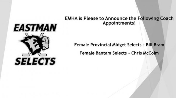 On March 23rd, 2017 the Eastman Minor Hockey Association appointed the Head Coaches for the Female Bantam and Midget AAA programs. The Selects would like to congratulate Bill and Chris on their respective appointments.